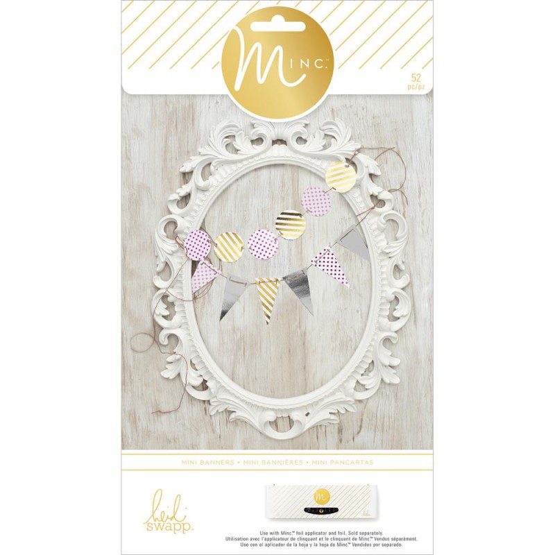 Formes en papier permettant de réaliser des guirlandes de fanions, ou mini-bannières, avec impression toner (permettant ainsi d'être personnalisés avec des feuilles de transfert métallisées à chaud) + ficelle blanche.